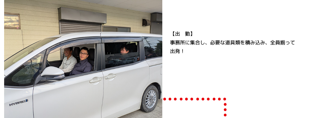 事務所に集合し、必要な道具類を積み込み、全員揃って出発します。
