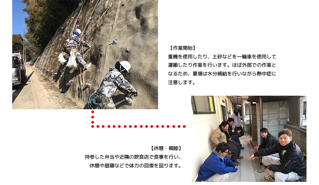 重機を使用したり、土砂などを一輪車を使用して運搬したり作業を行います。ほぼ外部での作業となるため、夏場は水分補給を行いながら熱中症に注意します。
