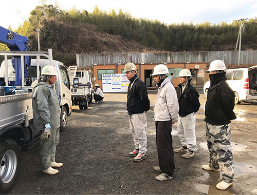 朝礼では、ラジオ体操と作業内容の確認が行います。また、絶対に労働災害が起こること無いよう安全に対して注意喚起を行います。