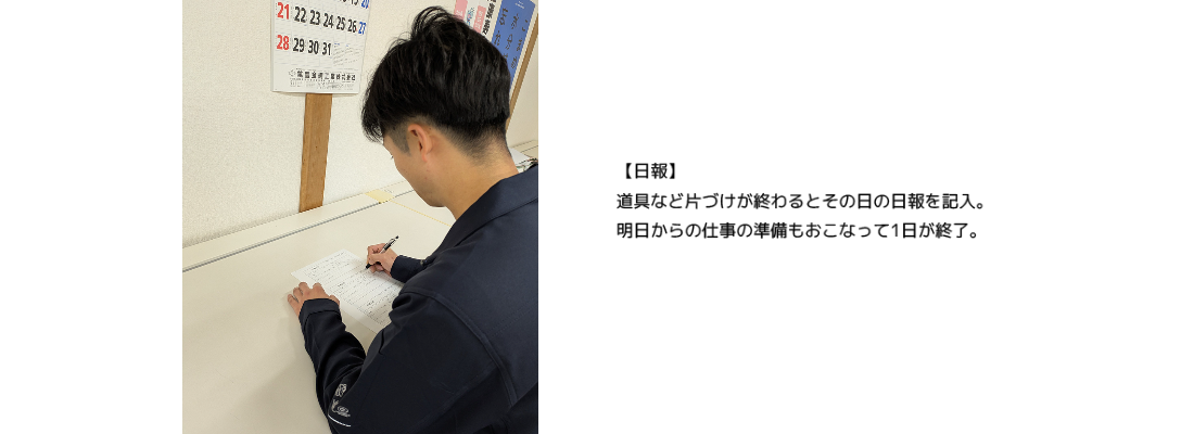 道具など片づけが終わるとその日の日報を記入。明日からの仕事の準備もおこなって1日が終了。