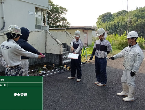 朝礼では、ラジオ体操と作業内容の確認が行います。また、絶対に労働災害が起こること無いよう安全に対して注意喚起を行います。